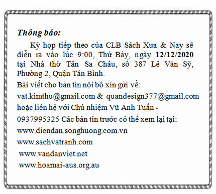 VÀI CHI TIẾT VỀ CUỘC HỌP NGÀY 10/10/2020 CỦA CLB SÁCH XƯA VÀ NAY Như thường lệ, để mở đầu phiên họp Dịch giả Vũ Anh Tuấn đã giới thiệu với các thành viên hai tân quý thư mà ông mới có. Hai tân quý thư lần này một bẳng tiếng A nh và một bằng Pháp văn. Cuốn bằng tiếng Anh mang tựa đề là Hãy viết cho đúng ! (Get it right !). Cuốn sách khổ 14 x 21,dày 673 trang là một loại tiểu tự điển bách khoa về cách nói và viết tiếng Anh cho đúng. Cuốn sách được in năm 79 năm trước (1941) bởi Funk & Wagnalls, một công ty in ấn thời danh của Mỹ, và được chia làm 20 chương mà chương đầu tiên là nói về “Chữ tắt”(Abbreviations) cực hay, còn 19 chương còn lại thì nói về đủ mọi lãnh vực sử dụng tiếng Anh như Viết và dùng Mẫu tự - Viết hoa - Viết chữ nghiêng - Văn phạm - Viết thơ - Viết báo cáo - Viết đơn thình nguyện - Viết số nhiều - Viết đúng chính tả - Viết báo vv… Cuốn sách là cả một giáo trình đầy đủ và hay, giúp cho người biết sử dụng nó viết tiếng Anh thật chuẩn, thật đúng. Có được cuốn sách, Dịch giả Vũ Anh Tuấn thích quá và ông tự hứa sẽ dành thời giờ tham khảo để ngày càng giỏi và càng viết đúng tiếng Anh hơn. Cuốn thứ nhì bằng Pháp văn mang tựa đề là “Chúng ta hãy đừng sợ những con chữ” (N’ayons pas peur des Mots) là một thứ tiểu tự điển tiếng lóng (argot ) và tiếng bình dân (language populaire) trong Pháp ngữ. Cuốn sách cũng khổ 14 x 21, dày 320 trang được in năm 29 năm trước (1991) ở Pháp bởi nhà xuất bản lừng danh Larousse, và được chia làm hai phần. Phần một là một số những bài thơ trong chứa đựng rất nhiều từ bình dân và từ lóng mà chỉ mới đọc lướt qua đã thấy rất lạ và vui, còn phần hai là phần nói về “tiếng Pháp như mọi tầng lớp dân gian thường nói” và là cả một kho tàng khủng về từ bình dân và từ lóng, trong tất cả mọi lãnh vực của cuộc sống tỷ dụ như về Cơ thể người đàn ông và đàn bà - Quần áo - Tiền bạc - Sân khấu - Âm nhạc - Chợ búa - Xe hơi - Tư pháp - Nhà tù - Chợ trời vv… và cả tiếng lóng và tiếng bình dân thuộc Giáo hội, giáo sĩ. Tóm lại cuốn sách này thì lại là một kho tiếng bình dân và tiếng lóng trong Pháp ngữ là thứ tiếng Dịch giả Vũ Anh Tuấn được học từ lớp mẫu giáo, và dù nay đã hết hai mươi tuổi lần thứ tư cộng năm, ông ta vẫn thích… như thường và vô cùng. Sau khi được giới thiệu hai cuốn sách đã được một số thành viên truyền tay nhau xem một cách thích thú. Sau khi Dịch giả Vũ Anh Tuấn giới thiệu hai cuốn sách xong, anh Nhung đã lên kể với các thành viên việc anh ghé thăm anh Thanh Phong hiện không được khỏe, và hát tặng các thành viên một ca khúc. Sau anh Nhung, anh Phạm Vũ đã lên nói về Galilei và Newton khoảng 400 năm trước đã có những phát minh để chống dịch bệnh và nói về sự ra đời của vaccine. Anh Phạm Vũ nói xong Kim Mai lên hát tặng các thành viên hai bài Tình Yêu Thiên Chúa và bài Tình Cố Đô. Tiếp lời Kim Mai, anh Nhựt Thanh lên có bài nói về ý trời. Anh Nhựt Thanh nói xong, anh Thanh Vĩnh lên đọc tặng các thành viên bài thơ Tìm bạn mùa xuân. Sau anh Thanh Vĩnh, anh Thái Sơn lên hát tặng các thành viên một bài hát về Hà Nội. Anh Thái Sơn hát xong, anh Phùng Chí Tâm lên hát tặng các thành viên bài Cây Xương rồng là một bài thơ của Thanh Tùng mà chính anh Tâm phổ nhạc. Sau Anh Tâm, chị Thanh Xuân lên chúc sức khỏe mọi người và đọc tặng các thành viên bài thơ Nhớ quê. Chị Thanh Xuân đọc thơ xong, Lệ Ngọc lên ca tặng các thành viên một ca khúc. Sau Lệ Ngọc, Hoài Ly lên hát tặng các thành viên bài Em và tôi và một bài chưa đặt tên do chính Hoài Ly viết. Tiếp lời Hoài Ly, chị Diệu lên ca tặng các thành viên một bài ca Việt-Pháp, bài Tuyết rơi (Tombe la neige). Chị Diệu hát xong, Thùy Hương lên hát tặng các thành viên một bài về Đà Nẵng và một bài về Huế để nhớ về Miền Trung. Sau Thúy Hương, Quan Thúy Mai lên hát tặng các thành viên bài Nắng Thủy Tinh của Trịnh Công Sơn. Quan Thùy Mai hát xong, Kim Sơn lên hát tặng các thành viên bài Thu Vàng của Cung Tiến. Sau Kim Sơn, anh Hùng lên nói về sức khỏe và về thở. Anh Hùng nói xong, chị Thụy Hải lên đọc tặng các thành viên bài thơ Anh và hát bài Mùa xuân của anh mà chị mới phổ nhac. Chị Thụy Hải hát xong, anh Duy Hà lên đọc tặng các thành viên bài thơ Nhớ cố hương, và hát tặng các thành viên bài Tình thắm duyên quê. Cuối cùng Ngàn Phương nhờ chị Thụy Hải ngâm hộ một bài thơ của Ngàn Phương để tặng các thành viên và cuộc họp kết thúc lúc 11 giờ 20. Các thành viên vui vẻ ra về, hẹn nhau gặp lại trong lần họp sau. Vũ Thư Hữu